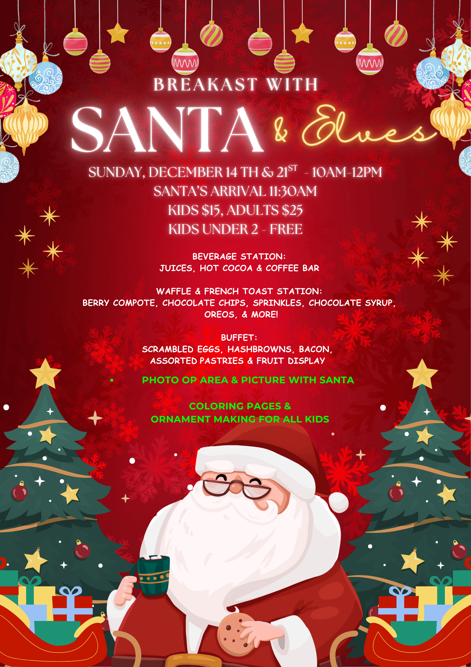 Enjoy a delightful breakfast buffet featuring all your morning favorites — a French toast and waffle station, freshly scrambled eggs, crispy bacon, golden hashbrowns, and more! Sip and savor from our beverage station while the kids light up with excitement meeting Santa Claus himself! 🎁