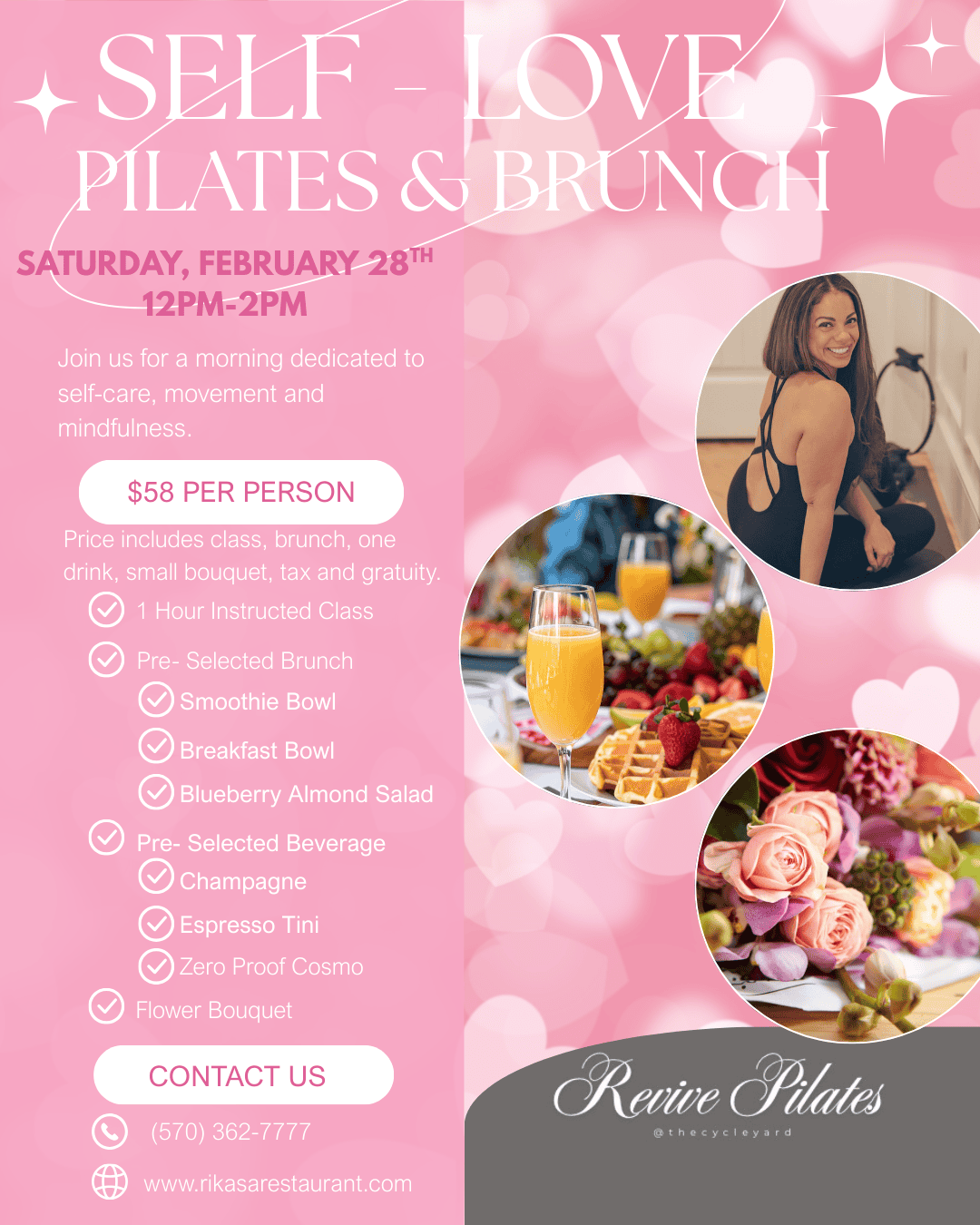 Treat yourself to the ultimate feel-good afternoon at Rikasa! Join us Saturday, February 28th from 12PM–2PM for Self Love Saturday: Pilates & Brunch, a perfect blend of movement, mindfulness, and mouthwatering brunch, led by Erica from Revive Pilates.