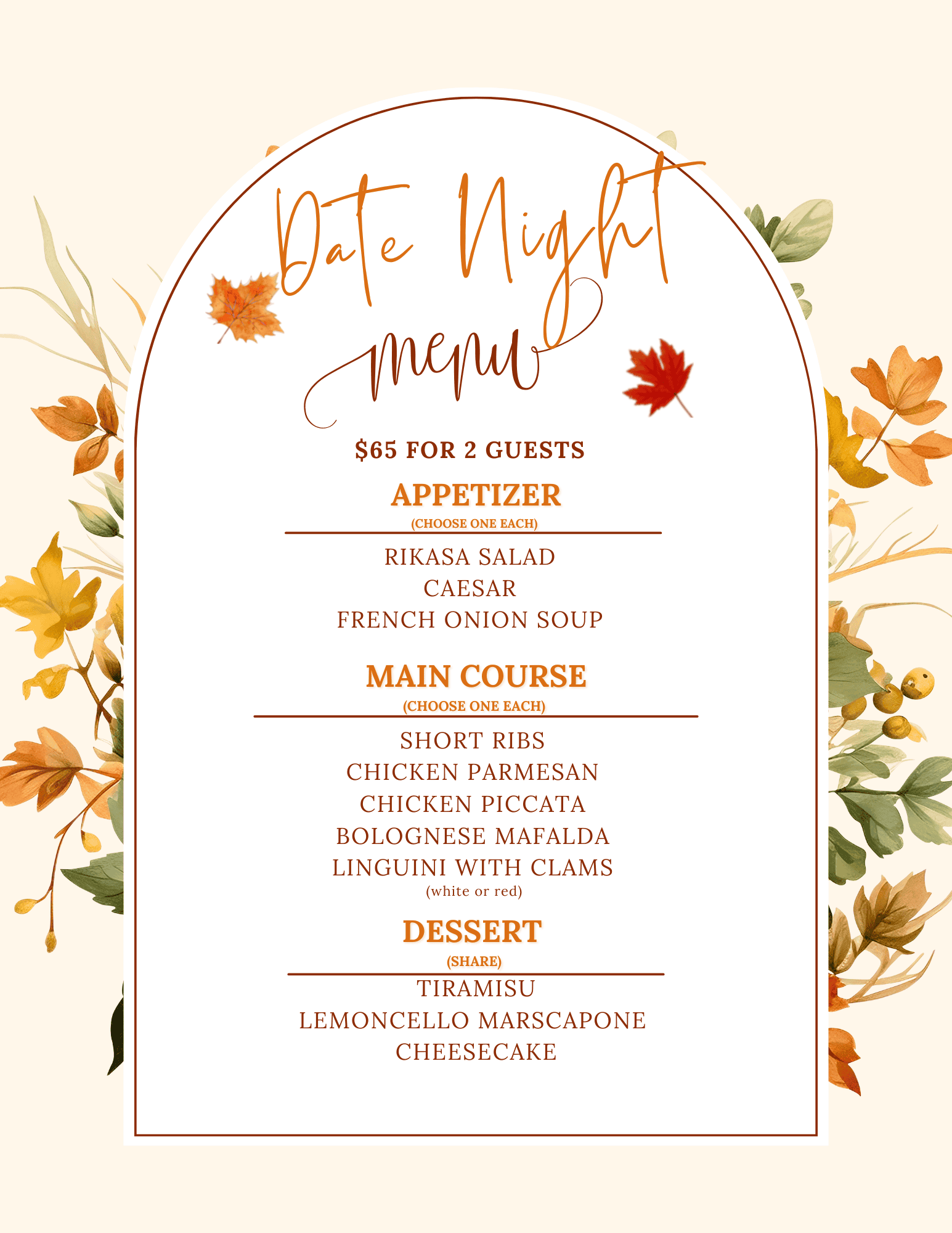🍝 Main Course: Short Ribs, Chicken Parmesan, Chicken Piccata, Bolognese Mafalda, or Linguini with Clams (white or red)